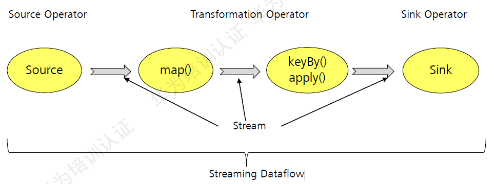 Source操作符载入数据,通过map(), keyBy(), apply()等Transformation操作符处理stream。数据处理完成后,调用sink写入相关存储系统,如HDFS、HBase、Kafka等。