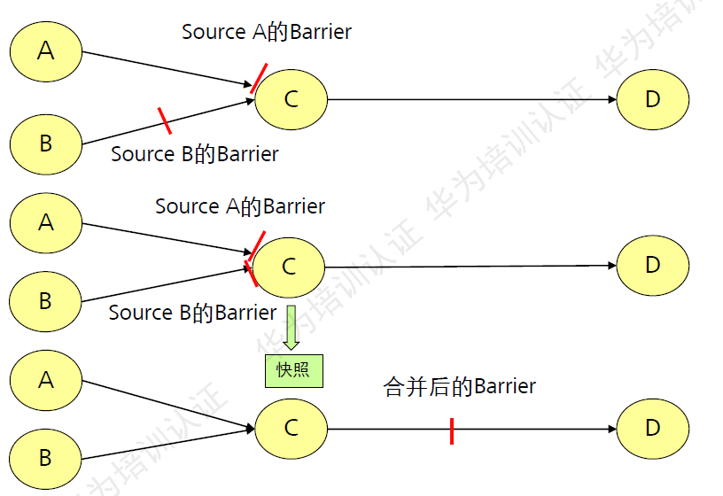 当一个算子上游有多个来源时,它会将首先接收到barrier端阻塞掉,等待其他输入端的barrier,只有当接收到所有输入端的barrier时,该算子才会开始合并barrier执行制作快照过程,并将合并后的barrier广播到下游算子。