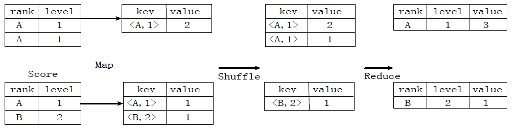 存在一个分组(Group By)操作,其功能是把表Score的不同片段按照rank和level的组合值进行合并,计算不同rank和level的组和值分别有几条记录。