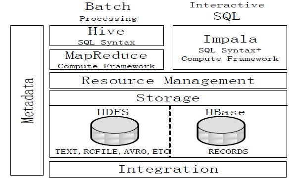 说明:Impala中的元数据直接存储在Hive中。Impala采用与Hive相同的元数据、SQL语法、ODBC驱动程序和用户接口,从而使得在一个Hadoop平台上,可以统一部署Hive和Impala等分析工具,同时支持批处理和实时查询。