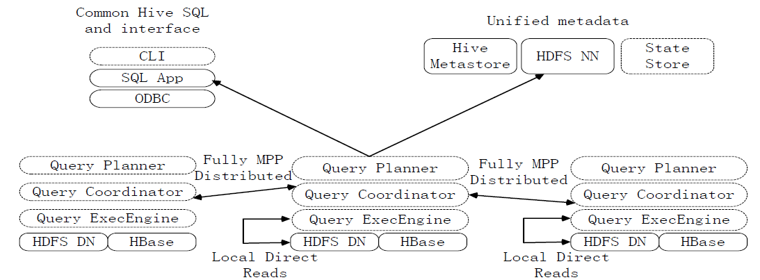 Impala和Hive、HDFS、HBase等工具是统一部署在一个Hadoop平台上的。Impala主要由Impalad,State Store和CLI三部分组成。
