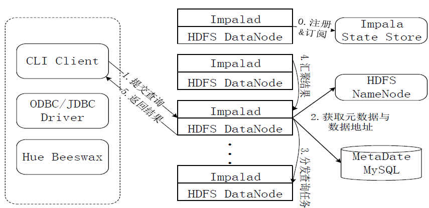 第0步,当用户提交查询前,Impala先创建一个负责协调客户端提交的查询的Impalad进程,该进程会向Impala State Store提交注册订阅信息,State Store会创建一个statestored进程,statestored进程通过创建多个线程来处理Impalad的注册订阅信息。