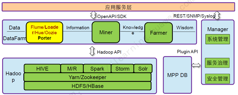 FusionInsight HD提供大数据处理环境,基于社区开源软件增强,安装场景选择业界最佳实践;Porter是FusionInsight HD的数据集成服务,提供与Hadoop集群多种交换数据方式(包括Loader,Flume,SFTP)及Hadoop图形界面(Hue)。