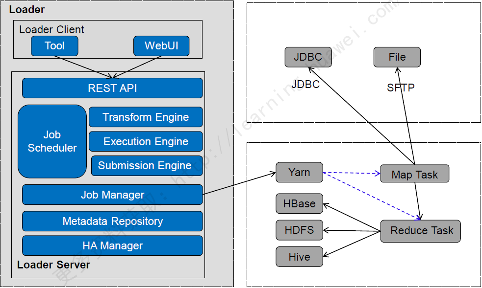 Loader的服务端,主要功能包括:处理客户端请求,管理连接器和元数据,提交MapReduce作业和监控MapReduce作业状态等。
