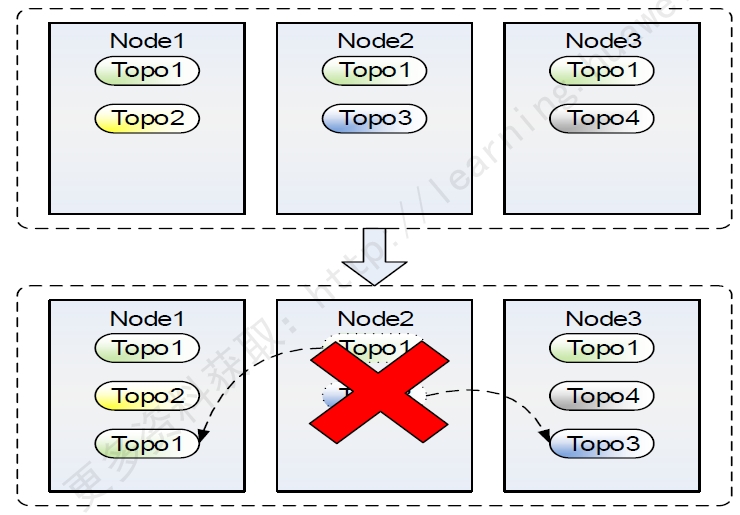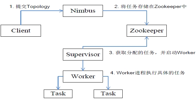 所有Topology任务的提交必须在Storm客户端节点上进行,提交后,由Nimbus节点分配给其他Supervisor节点进行处理。