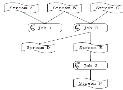 一个数据流图是由多个作业构成的,其中,图中的每个节点表示包含数据的流,每条边表示数据传输。