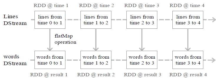 Spark Streaming最主要的抽象是DStream(Discretized Stream,离散化数据流),表示连续不断的数据流。在内部实现上,Spark Streaming的输入数据按照时间片(如1秒)分成一段一段的DStream,每一段数据转换为Spark中的RDD,并且对DStream的操作都最终转变为对相应的RDD的操作。