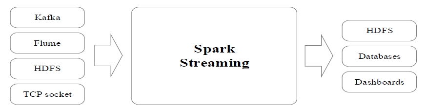 Spark Streaming可整合多种输入数据源,如Kafka、Flume、 HDFS,甚至是普通的TCP套接字。经处理后的数据可存储至文件 系统、数据库,或显示在仪表盘里。