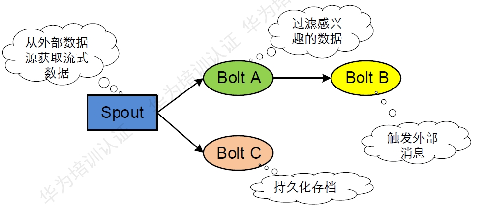 但两者的任务大不相同,主要的不同是:MapReduce作业最终会完成计算并结束运行,而Topology将持续处理消息(直到人为终止)。