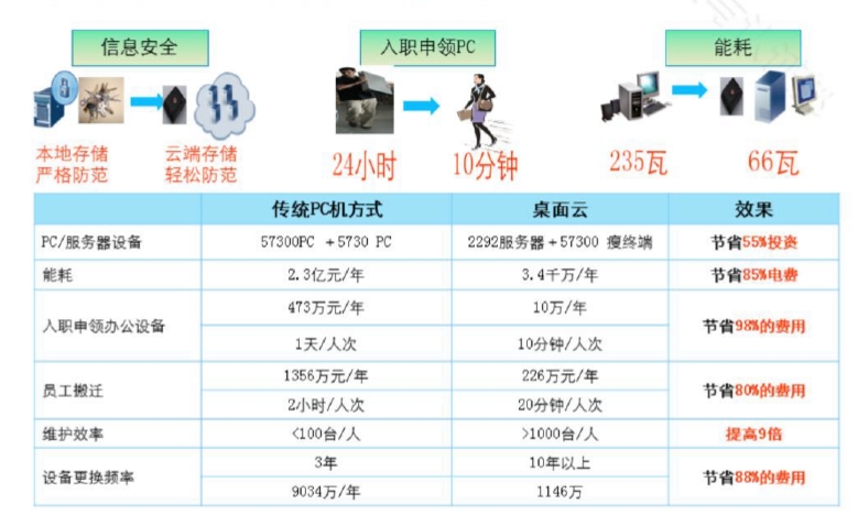 从华为的使用情况来看,使用桌面云构建办公系统之后,可以从设备成本、能耗、维护人力、设备更新等几个方面降低企业的成本。