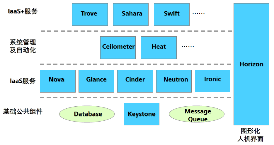 OpenStack项目涵盖了IaaS层常用的服务类型、部分系统管理及自动化相关服务,和一些重要的IaaS+服务。