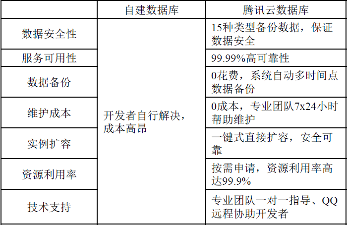图:腾讯云数据库和自建数据库的比较