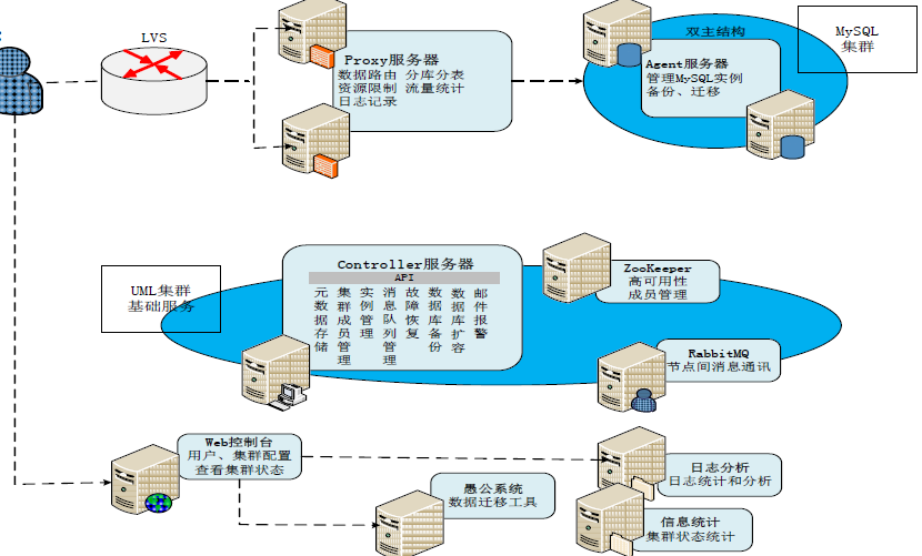 Controller服务器向UMP集群提供各种管理服务,实现集群成员管理、元数据存储、MySQL实例管理、故障恢复、备份、迁移、扩容等功能.