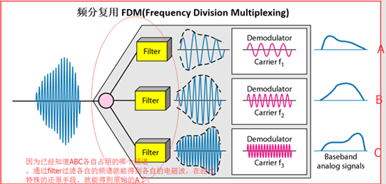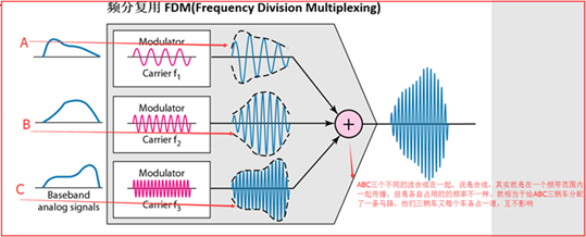 用户在分配到一定的频带后,在通信过程中自始至终都占用这个频带(这个是一个范围,例如下图),所有用户在同样的时间占用不同的带宽资源(请注意,这里的“带宽”是频率带宽而不是数据的发送速率)