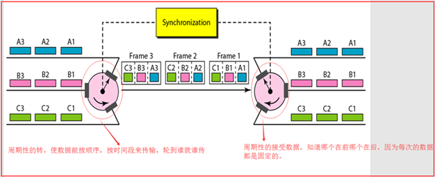 通俗来讲:就是每个用户都有自己的时间段来传输数据,没到自己时间就需要等待,直到属于自己的传输时间段的到来,周期性的周转